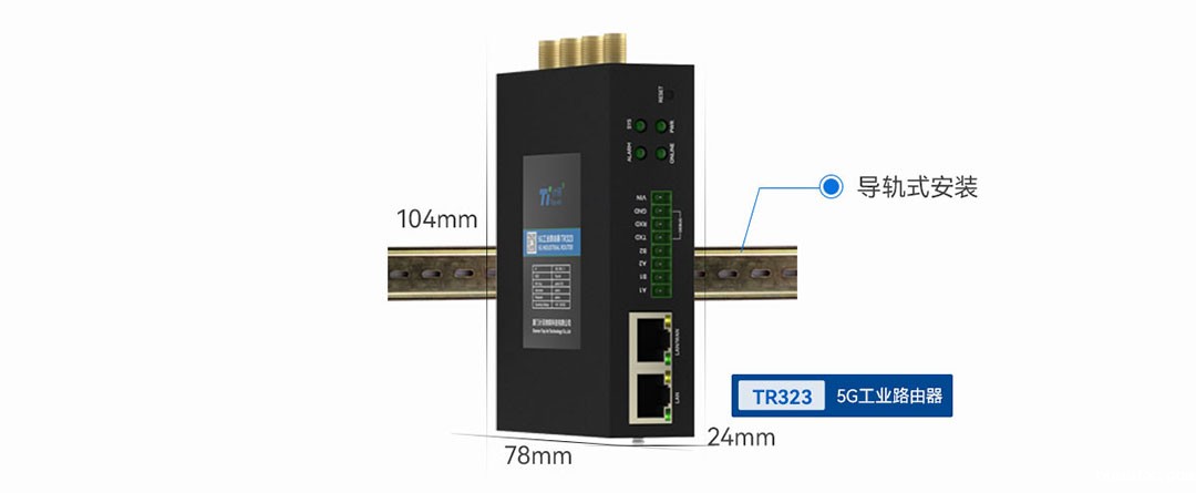 小体积5G工业路由器TR323,外形104*78*24mm,体积轻巧,导轨式便捷安装。