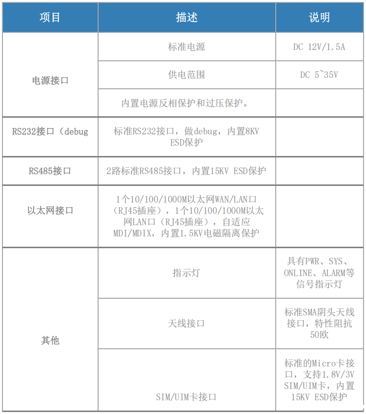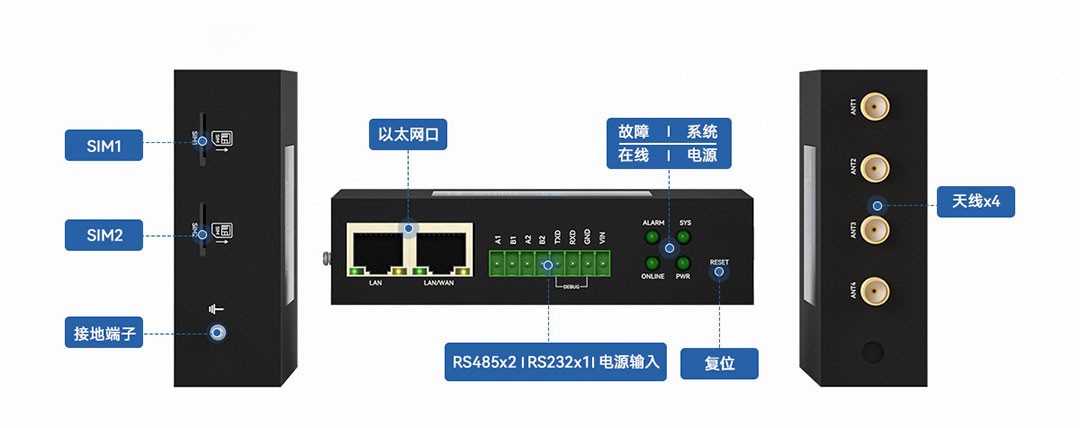 双SIM卡(标准的Micro卡接口,支持1.8V/3V SIM/UIM卡),4*5G天线,1×LAN、1×WLAN/LAN、1×RS232(debug)、2×RS485。