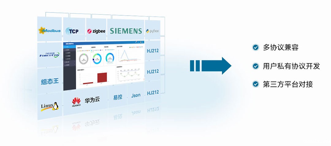 支持西门子、松下、欧姆龙、三菱等工业PLC协议,支持用户私有协议开发,支持主流物联网平台对接。